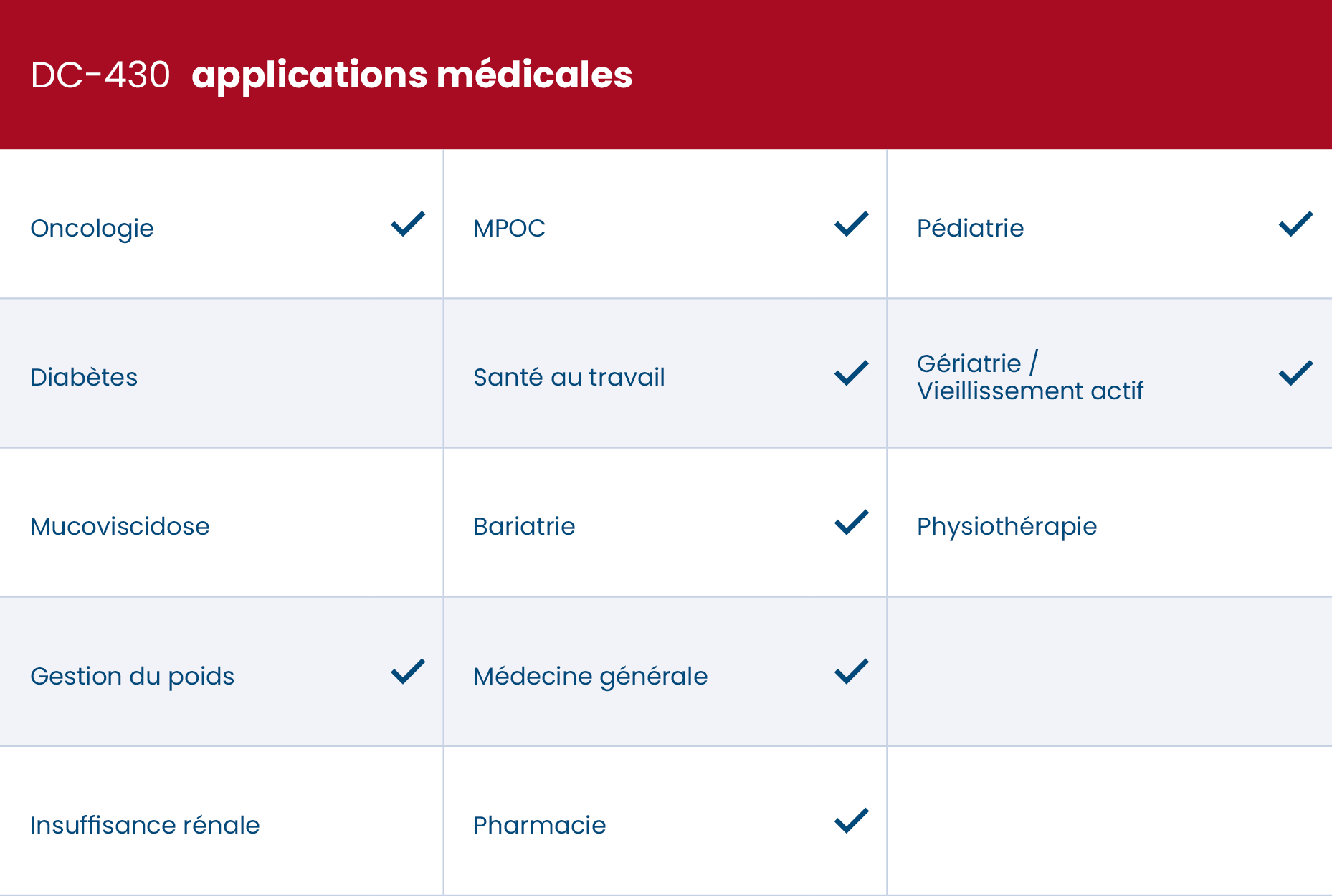 Le DC-430MA est médicalement validé pour la classe de précision MDD Classe II-a et NAWI Classe III, ce qui le rend parfaitement adapté à être utilisé dans un environnement médical. Une image précise de leur santé du patient apparaît grâce à l'analyse d'impédance bioélectrique (BIA) à double fréquence.