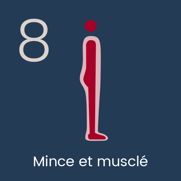 Mince et musclé signifie que vous avez une faible quantité de graisse corporelle et un niveau normal de masse musculaire. Un corps rêvé pour le maillot de bain ! Attention les gens peuvent être très jaloux de vous !