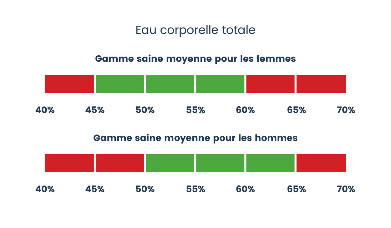 Le pourcentage d'eau corporelle idéal varie. Il est influencé par différents facteurs. Le sexe, l'âge et la composition corporelle affectent ce pourcentage. En général, les femmes ont un pourcentage d'eau corporelle inférieur à celui des hommes. C'est parce que les femmes ont plus de tissus que les hommes. Le pourcentage idéal pour les femmes adultes fluctuera entre 45 et 60 %, tandis que le pourcentage idéal pour les hommes adultes se situera entre 50 et 65 % du corps total. Pour les profils athlétiques, il est même recommandé d'avoir 5% d'eau corporelle en plus que la moyenne des adultes.