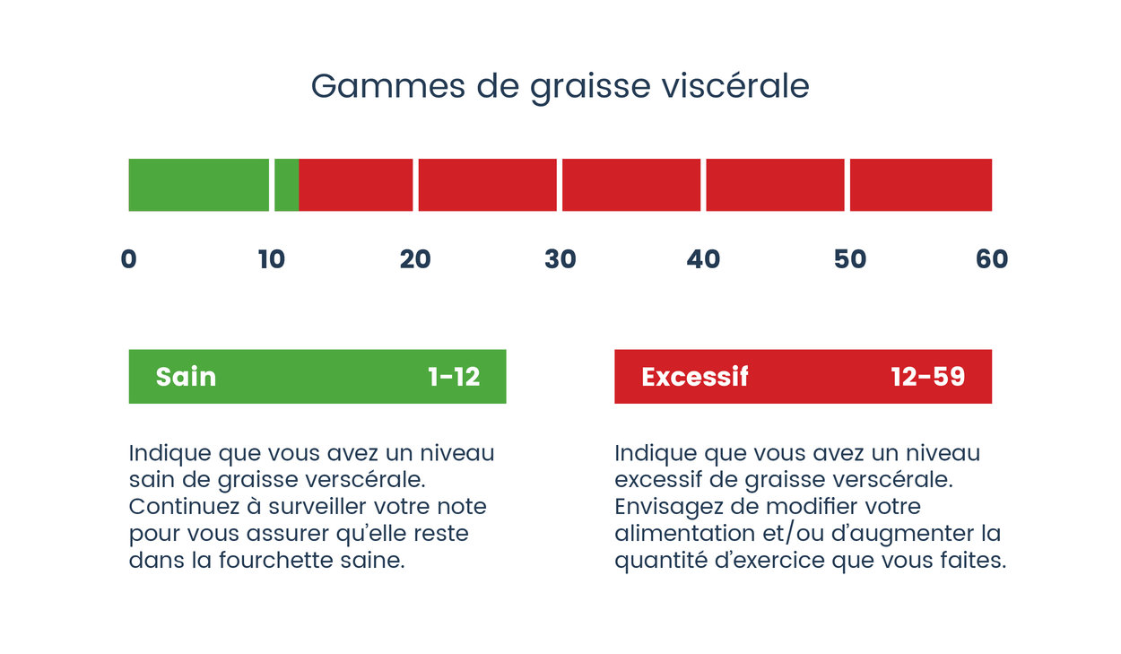 L'analyseur de composition corporelle Tanita peut localiser et calculer votre excédent de graisse viscérale de manière précise et instantanée. Une fois sur la balance, celle-ci vous donne une échelle de valeurs comprise entre 1 et 59. Un score entre 1 et 12 indique un niveau de graisse viscérale sain. Un score compris entre 13 et 59 indique un surplus de graisse viscérale.