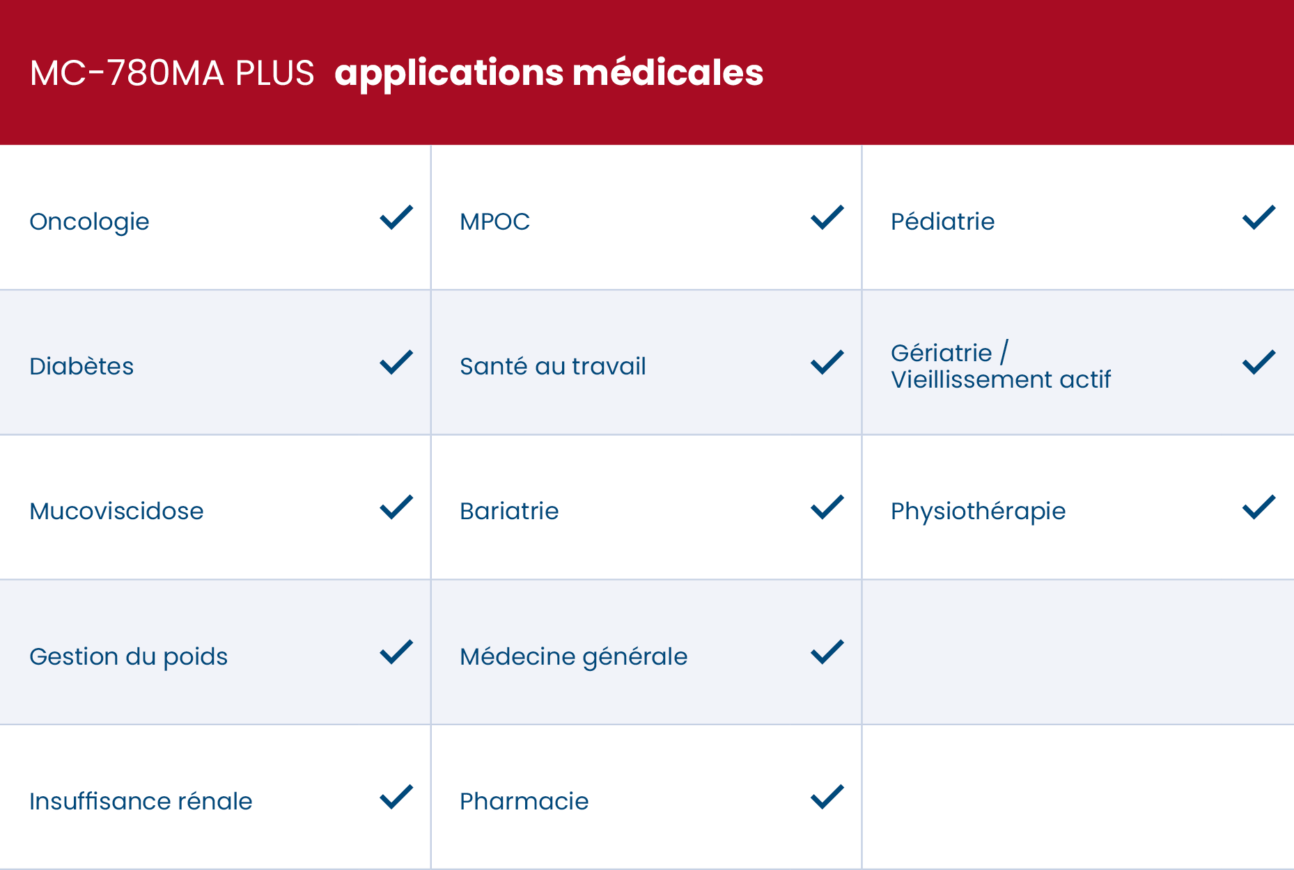 Cet analyseur de composition corporelle segmentaire professionnel est également disponible dans le modèle MC-780MA S. La différence entre cet analyseur et le MC-780MA P est la présence de la colonne.