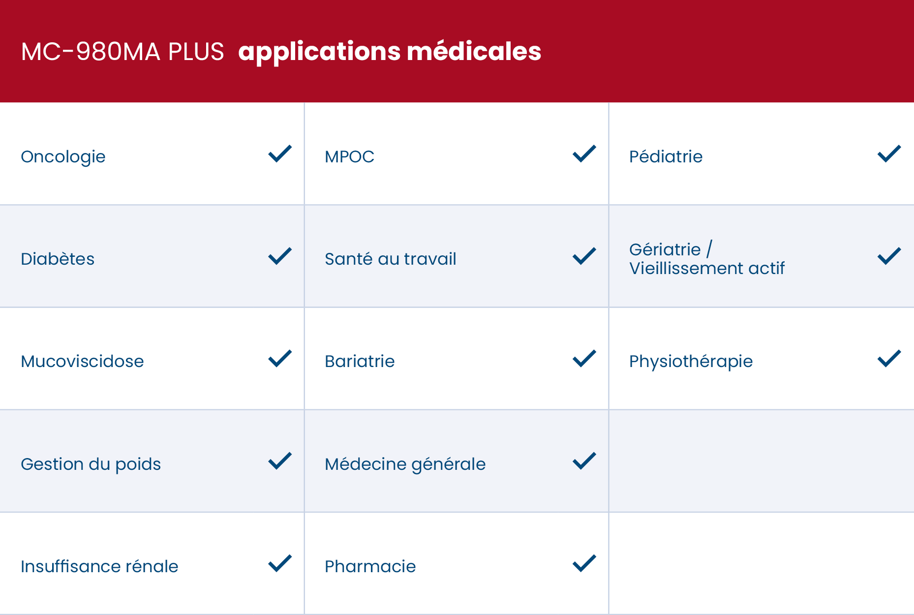 Le MC-980MA PLUS est l'ultime analyseur de composition de la santé et de la condition physique. Il a été conçu pour améliorer la prestation de services des professionnels de la santé. Technologie japonaise très avancée, mais extrêmement agréable à utiliser. Un exemple, le MC-980MA PLUS dispose d'un écran tactile extra large et le logiciel intégré est disponible en 14 langues.